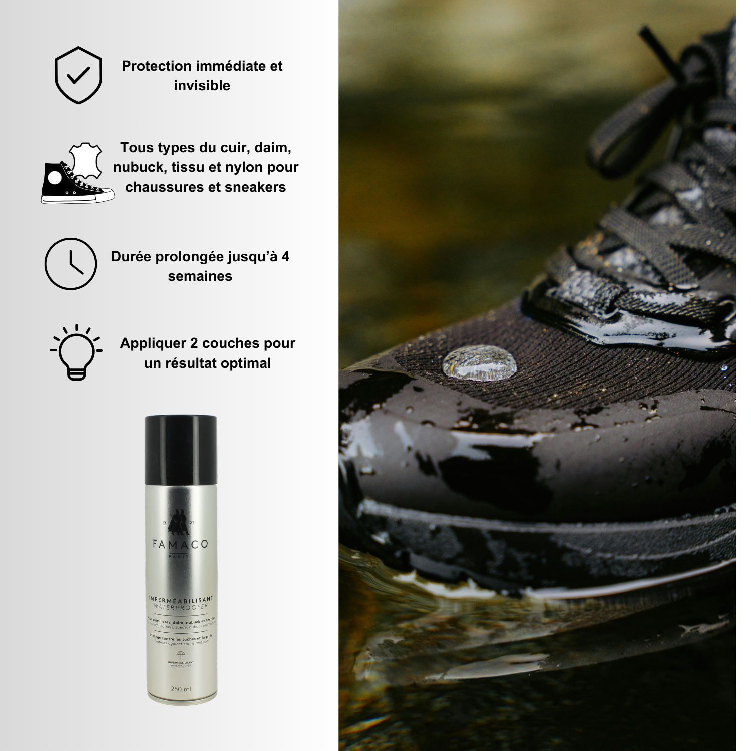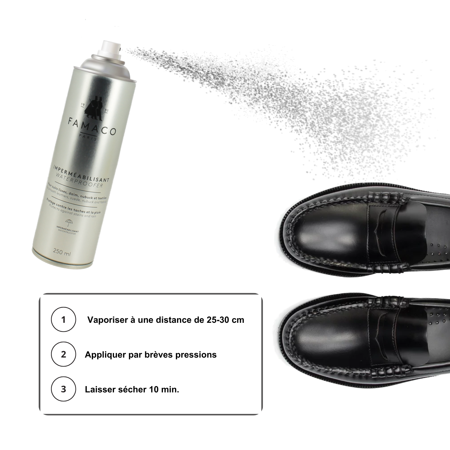- Vaporisez l'imperméabilisant Famaco à environ 25 cm de la chaussure par brèves pressions pour éviter de surcharger.